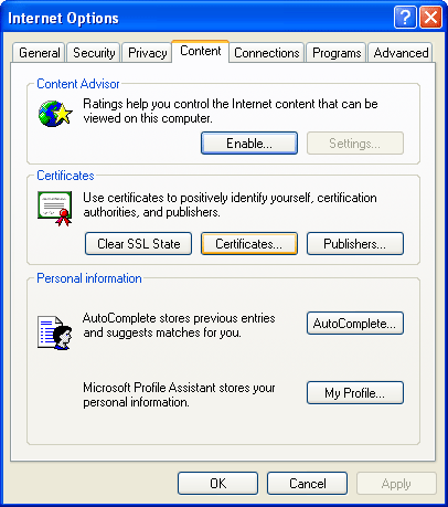 - Click on the 'Content' tab and click the 'Certificates' button.