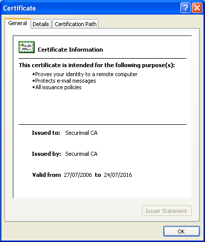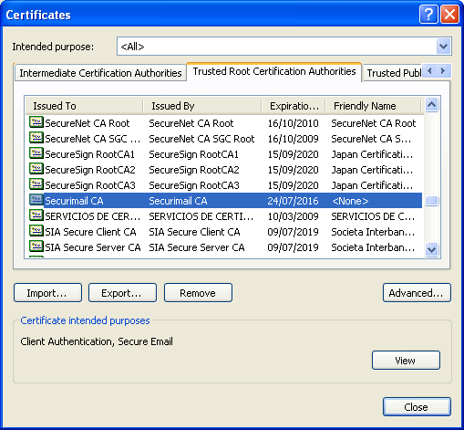 - Click on the 'Trusted Root Certification Authorities' tab and scroll down to the 'Securimail CA' entry.